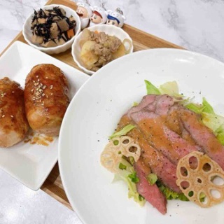はろ( * ・ω・)ノ゙夜飲みにいくので彼氏に作り置きごはん。🍚*ローストビーフのサラダ🥗*肉巻きおにぎり*高野豆腐とひじきの炒り煮*肉じゃが肉巻きおにぎりが好評だった🙎作ってる途中もめっちゃ美味しそうで自分でも食べたくなったからまた近いうちに作ろう🍖🍙とある日の彼氏弁当🍱載せてないお弁当があるので作った日付はバラバラです。*生姜焼き*ねぎいり卵焼き*ピーマンおかか和え画像整理的な……思い出。この時期らへんこんなの作ってたんや今はもっと上達してるなって数年後、思えたらいいな