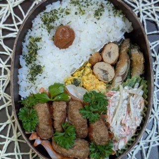 夫のお弁当おかずは私が詰め後でご飯を夫が詰めて写真を撮る私は夫が撮ってくれた写真を見て”おぅこんな感じになったのね””なるほど~!”とか”色間違ったかな”とかまぁいろいろ思う訳ですがたまにおかずを詰めすぎたかなと思うこともあります今回おかず入れすぎた?と一瞬思いましたがそうでもないかというか入れ方変だったな●ハンバーグ●ごぼうのサラダ●かぼちゃのサラダ●鯖の立田揚げ●ごぼう巻きレンコンつみれ●パセリ 皆さんが笑顔でいれますようにいつもありがとうございます読者登録はこちら