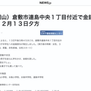 1 : (岡山)倉敷市連島中央1丁目付近で金銭授与 2月13日夕方 | NEWSjphttps://news.jp/i/1395202397316235573?c=134733695793120758岡山県警によると、13日午後5時45分ごろ、倉敷市連島中央1丁目付近の駐車場で男子中学生への金銭授与が発生しました。(実行者の特徴:女性、30〜35歳、長髪、赤色長袖、白色スカート) ■実行者の言動や状況 ・会話中の男子生徒らに声をかけ、金銭を渡した。 ・「お金に困るでしょ」 ・「これでお菓子でも買って食べて」全文はソースで