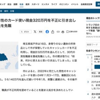 1 : 埼玉県坂戸市は16日、身寄りのない遺体の所持品として市が保管していたキャッシュカードを不正利用し、現金計320万円を盗んだとして、30代の男性職員を懲戒免職とした。市の聞き取りに「将来、何かに使えると思い引き出してしまった」と話している。 市によると、2022年に死亡した男性のキャッシュカードを使い24年11月3~17日、複数回にわたり計320万円を引き出した。うち140万円を盗んだ疑いで今年1月、県警に逮捕され、その後不起訴となっていた。 https://www.sankei.com/article/20260416-6WFEIAQCMZK3RFX5QFURE4CEWI/