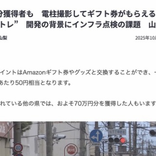 1 : 一般的な電柱だと1本あたり50円相当となります。 すでに行われている他の県では、およそ70万円分を獲得した人もいます。 このゲームが開発された背景にはインフラ点検の課題があります。▼動画 3 : 副業でやろうかな 6 : 14000枚の写真を送ってやっと70万か… 23 : >>6 1本あたり5枚撮る必要があるから7万枚だぞ