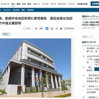 1 : 公明・斉藤代表、創価学会地区幹部に新党報告 原田会長は池田名誉会長著作で中道主義説明 公明党の支持母体である創価学会は18日、東京・信濃町の総本部と全国の会館をオンラインで結んだ全国地区部長・地区女性部長会を開いた。原田稔会長は、池田大作名誉会長が実践した中道主義の信念で立ち上がる時だと呼びかけた。開会に先立って、同党の斉藤鉄夫代表が立憲民主党との新党、中道改革連合結成の経緯を報告した。 19日付の学会機関紙「聖教新聞」によると、原田氏は、池田氏が作家の松本清張氏のインタビューに答えた「われわれの中道主義は、民衆から盛り上がったものである。仏法の中道主義という哲学を裏付けにしたものだ」という言葉を紹介。 池田氏の著書「新・人間革命」の「中道政治は、対峙する2つの勢力の中間や、両極端の真ん中をいくという意味ではありません。あるいは、両方から、そのよいところをとって、自己の生き方とするような折衷主義でもありません」「人間の尊厳を守り、平和と幸福を実現しゆく政治ということであります」といった記述を引用して中道主義を説明した。 全文はソースで 2 : わろたw 3 : お断りします