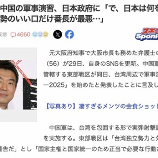 1 : 橋下徹氏 中国の軍事演習、日本政府に「で、日本は何をする?国内だけで威勢のいい口だけ番長が最悪…」 元大阪府知事で大阪市長も務めた弁護士の橋下徹氏(56)が29日、自身のSNSを更新。中国軍で台湾方面を管轄する東部戦区が同日、台湾周辺で軍事演習「正義使命―2025」を始めたと発表したことに言及した。 中国軍は、台湾を包囲する形で実弾射撃訓練を含む演習を実施する。東部戦区は「台湾独立勢力と外部干渉勢力に対する厳重な警告だ」とし「国家主権と国家統一のため正当で必要な行動だ」と主張した。 橋下氏は「で、日本は何をする?国内だけで威勢のいい口だけ番長が最悪。まずは力を付けてから」と自身の見解をつづった。 4 : なにいってんだ? 5 : なぜ軍事演習に対していちいち何かしなきゃならんの?