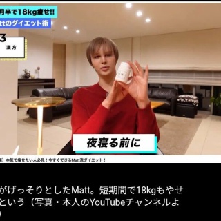 1 : 1月19日までに、タレントのMattが自身のYouTubeを更新し、マイナス18kgのダイエットに成功したという近影を披露した。 さらに動画内では、ダイエットの全貌を公開したが、その壮大な減量方法が話題となっている。 「Mattさんは2025年11月、都内でおこなわれた『mix.tokyo POP UP STORE meets HOLIDAY』のオープニングイベントに登場しました。ファッションモデルとしても活動しているMattさんですが、9月におこなわれた海外ファッションウィークのために届いた衣装が入らず、それをきっかけに、82kgあった体重を1カ月ちょっとで66kgまで減量したと明かし、話題となりました」(芸能プロ関係者) Mattがアップしたのは『【超緊急動画】本気で痩せたい人必見!今すぐできるMatt流ダイエット!』と題した動画。 43分と長尺で、大幅なダイエット方法を明かした。しかしその内容は物議を醸し、コメント欄には疑問も寄せられた。 「Mattさんは『運動』『エステ』『漢方』『食事改善』の4つに取り組んだことを明かしました。なかでも行きつけのエステには、ジムの後に毎日2時間、痩身の機械をかけてもらいに通っていたと告白し、さらに、そのエステで購入した漢方を毎日飲んでいたといい、その漢方は1カ月分で4万6200円とかなり高額なものでした」(前出・芸能プロ関係者) それだけにとどまらず、さらに1カ月分9350円というデトックスのための漢方など、複数のサプリメントを紹介。実際のエステでは、脂肪細胞を溶解することができる注射を打つなど、美容医療を駆使した内容が公開された。全文はソースで 7 : 漢方(笑) その薬大丈夫なのか 9 : 首が結構ごついな 打撃戦に強そう