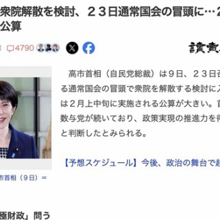 1 : 高市首相(自民党総裁)は9日、23日召集が予定される通常国会の冒頭で衆院を解散する検討に入った。衆院選は2月上中旬に実施される公算が大きい。首相は参院で少数与党が続いており、政策実現の推進力を得る必要があると判断したとみられる。 政府関係者が明らかにした。衆院選の日程は「1月27日公示―2月8日投開票」「2月3日公示―15日投開票」の案が浮上している。 首相は「強い経済」「責任ある積極財政」を主張しており、自身の経済政策について国民の信任を得たい考えだ。 続きは↓ 7 : 解散! 15 : いいぞ 面白くなってきた