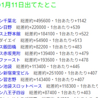 過去の1月11日出てたとこ2025年・マルハン千葉北 総差約+495600・1台あたり+1142・マルハン日野 総差約+220000・1台あたり+539・エスパス上野本館 総差約+184100・1台あたり+522・ニューダイエイ 総差約+54900・1台あたり+513・プレサス飯田橋 総差約+82200・1台あたり+483・エスパス赤坂見附 総差約+139400・1台あたり+479・エクサファースト 総差約+193500・1台あたり+478・マルハン池袋 総差約+113400・1台あたり+445・マルハン新宿東宝ビル 総差約+251000・1台あたり+407・マルハン習志野 総差約+143400・1台あたり+407・マルハン池袋スロットベース 総差約+118300・1台あたり+405・マルハン八王子四谷 総差約+87400・1台あたり+403・ジャムフレンドクラブ朝霞 総差約+94300・1台あたり+396・マルハン橋本台 総差約+124000・1台あたり+388・マルハン小岩スロ館 総差約+115200・1台あたり+384・新橋UNO 総差約+83300・1台あたり+384・レッドロック学芸大学駅前 総差約+53400・1台あたり+373・エスパス上野新館 総差約+134300・1台あたり+368・仙川UNO 総差約+124800・1台あたり+367・マルハン蒲田駅東 総差約+139800・1台あたり+364・アイランド筑西 総差約+111450・1台あたり+348・マルハン昭島 総差約+96000・1台あたり+345・アミューズ浅草 総差約+155000・1台あたり+337・アミューズ千葉 総差約+164000・1台あたり+332・COSMO405 総差約+83800・1台あたり+332・アロー池上 総差約+87600・1台あたり+313・コンサートホール志村 総差約+39100・1台あたり+310・マックス石岡 総差約+100700・1台あたり+302・楽園渋谷駅前 総差約+98300・1台あたり+300・エンジェル本店 総差約+58600・1台あたり+297・ハイパージアス立川 総差約+110900・1台あたり+291・アビバ四街道 総差約+105700・1台あたり+287・エスパス渋谷新館 総差約+115800・1台あたり+286・楽園池袋 総差約+116800・1台あたり+272・フジ相模原 総差約+41900・1台あたり+270・ビックマーチ藤代 総差約+98800・1台あたり+263・ニュースター一ツ家 総差約+29400・1台あたり+245・メッセ西荻窪 総差約+66600・1台あたり+239・マルハン東大和 総差約+106800・1台あたり+233・アスカ熊谷駅前 総差約+16700・1台あたり+232・楽園蒲田 総差約+128800・1台あたり+227・ジアス南大沢 総差約+67300・1台あたり+227・アバンザ十条 総差約+22700・1台あたり+227・マルハン青梅新町 総差約+124900・1台あたり+220・コンサートホールエフ成増 総差約+94100・1台あたり+211・秋葉原UNO 総差約+41400・1台あたり+210・デルパラ9東浅川 総差約+110400・1台あたり+209・メッセ吉祥寺 総差約+86300・1台あたり+208・遊劇場Ⅲ 総差約+19400・1台あたり+2022024年・マルハン阿見 総差約+191100・1台あたり+629・ともえ大和 総差約+184000・1台あたり+612・YASUDA5 総差約+125000・1台あたり+498・マルハンつくば 総差約+159100・1台あたり+482・フェイス1100瑞穂 総差約+173000・1台あたり+459・カレイド下北沢 総差約+54000・1台あたり+438・マルハンメガシティ柏 総差約+202500・1台あたり+373・エスパス渋谷新館 総差約+146700・1台あたり+365・アミューズ千葉 総差約+168000・1台あたり+341・練馬オーシャン 総差約+62000・1台あたり+325・朝霞UNO 総差約+61000・1台あたり+324・キング世田谷 総差約+66000・1台あたり+316・マルハン鷺宮 総差約+93700・1台あたり+293・つつじヶ丘ワールド 総差約+28000・1台あたり+293・エスパス上野本館 総差約+102500・1台あたり+290・ニュースター一ツ家 総差約+35000・1台あたり+289・レッドロック学芸大学駅前 総差約+41000・1台あたり+285・八柱UNO 総差約+60000・1台あたり+262・マルハン蒲田駅東 総差約+92300・1台あたり+249・南柏UNO 総差約+62000・1台あたり+246・BIGディッパー花小金井 総差約+35000・1台あたり+244・楽園港北インター 総差約+31000・1台あたり+242・マルハン新宿東宝ビル 総差約+141500・1台あたり+238・アサヒ森下 総差約+32000・1台あたり+237・ダイナム金町南口 総差約+64000・1台あたり+229・マルハン小岩スロ館 総差約+65700・1台あたり+219・ともえ東金SideⅡ 総差約+50000・1台あたり+219・上福岡UNO 総差約+17000・1台あたり+216・ジャムフレンドクラブ朝霞 総差約+51000・1台あたり+213・ときわホール 総差約+32000・1台あたり+204・メッセ昭島 総差約+71000・1台あたり+202・123+N東雲 総差約+77000・1台あたり+2002023年・やすだ柏 総差約+344000・1台あたり+1075・123+N東雲 総差約+237300・1台あたり+575・楽園アメ横 総差約+205000・1台あたり+524・オーパスワン立石 総差約+68100・1台あたり+486・エクサ成増会館 総差約+54000・1台あたり+351・楽園立川 総差約+205000・1台あたり+342・グランキコーナ相模原 総差約+139000・1台あたり+337・マルハン新宿東宝ビル 総差約+154800・1台あたり+315・エスパス渋谷新館 総差約+119000・1台あたり+296・アイランド秋葉原 総差約+109450・1台あたり+290・マルハン大山 総差約+53900・1台あたり+284・マルハン日野 総差約+81600・1台あたり+262・PIA上野 総差約+67000・1台あたり+261・マルハン亀有 総差約+97800・1台あたり+257・エクスアリーナ松戸 総差約+68000・1台あたり+250・マルハン八王子四谷 総差約+44500・1台あたり+246・マルハン習志野 総差約+73400・1台あたり+239・マルハン昭島 総差