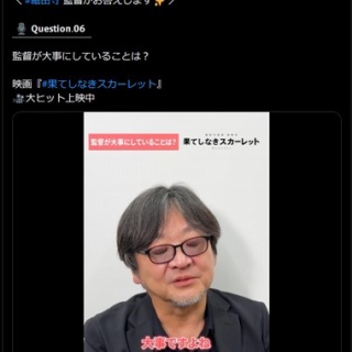 1: 名無し 2025/11/30(日) 01:20:41.06 ID:bzXhvACO9 【公式】『果てしなきスカーレット』@スタジオ地図@studio_chizu⠀⠀ 皆さまからいただいた質問に\ #細田守 監督がお答えします✨ / 🎙️ 𝗤𝘂𝗲𝘀𝘁𝗶𝗼𝗻.𝟬𝟲 ̄ ̄ ̄ ̄ ̄ ̄ ̄ ̄監督が大事にしていることは?映画『#果てしなきスカーレット』🎥大ヒット上映中