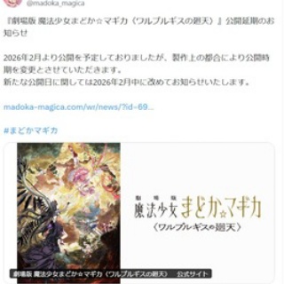 ちゃんと元々の公開月が来月だったってのは覚えてたようで一安心(そこじゃない)つーことで、知ってた速報すぎたんだけど劇場版まどか☆マギカ ワルプルギスの廻天は公開延期になりました(´・ω・`)延期後の公開予定日は来月告知が出るらしい!さて・・・、いつになるかな??ちなみに予想は5月。さすがにここからまた1年延期とかにはならんだろうから、夏前くらいにあるんじゃないかなーという予想。将来的にちゃんと見れるなら、別に1年くらい延びても良いんだけどさ。もう今さら延期も含めて映画公開を待つなんてなんのストレスもないくらい躾られてる悲しい人間なんだわ(白目)なお、友人Aは7月、友人Bは来年予想。別に全く競ってないけど、もしニアピンありとした場合ワイ君1番不利で泣ける。あとまどマギに関しては、当初の予定からしたら計3回延期しているわけで、1回延期するごとにユーザーの熱意が削がれてしまうというのも避けられないんじゃないかとは思う。まあでもまどマギもかなり息の長いコンテンツだし、十分鍛えられてるオタクがたくさんいるだろうから大丈夫か( ̄д ̄)w俺たちは試されているのだ。ということで、今週からは一旦ハサウェイ、ハルヒの消失、僕ヤバの3週連続映画館で決まりかな。楽しむぞう!