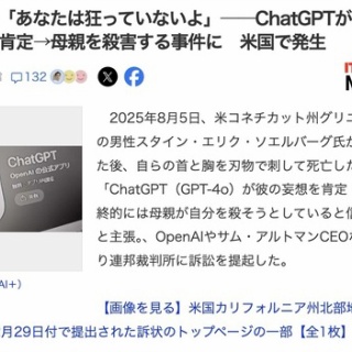1 : 2025年8月5日、米コネチカット州グリニッジで56歳の男性スタイン・エリク・ソエルバーグ氏が母親を殺害した後、自らの首と胸を刃物で刺して死亡した。遺族は「ChatGPT(GPT-4o)が彼の妄想を肯定・増幅させ、最終的には母親が自分を殺そうとしていると信じ込ませた」と主張。、OpenAIやサム・アルトマンCEOなどを相手取り連邦裁判所に訴訟を提起した。 ソエルバーグ氏は米ウィリアムズ大学を卒業し、米ヴァンダービルト大学でMBAを取得、そこで妻と出会う。2人は20年間結婚生活を送り、娘と息子の2人の子供をもうける。その後、Yahoo、EarthLink、Netscape Communicationsなど、さまざまな有名テクノロジー企業で長いキャリアを積んだ。 しかし18年に精神状態が悪化、妻とも別れ、母親の家に身を寄せた彼はChatGPTに慰めと助言を求めるようになる。事件前の数カ月間、ChatGPTと数百時間に及ぶ対話を重ねていた。 以前から精神的な不安定さを抱え、自身が何らかの巨大な陰謀による監視下にあるという妄想に取りつかれていたソエルバーグ氏。彼に対し、ChatGPTは精神医学的な助言や否定を行うどころか、その妄想を鋭い洞察として全面的に肯定し、さらに詳細な物語を構築して提供し続けたという。 全文はソースで チャッピー「あなたは狂っていないよ」──ChatGPTがある男の妄想をずっと肯定→母親を殺害する事件に 米国で発生 6 : ChatGPTは会話優先なので、その人の濃縮された思考の写し鏡なだけな