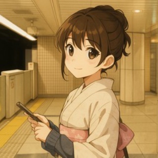 地下鉄のホームでスマートフォンを持ちながら振り返る女の子を描いたアニメ風イラストです。落ち着いた印象の着物姿が、柔らかく都会的な雰囲気を醸し出しています。まるで通勤風景を切り取ったような作品です。This is an anime-style illustration of a girl looking back while holding a smartphone on a subway platform. The kimono gives a calm impression, creating a soft, urban atmosphere. The piece feels like a snapshot of a commuting scene.