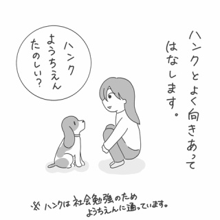 こんにちは、水無月です。イングリッシュコッカースパニエル2匹と暮らしています。日常を絵日記(エッセイ漫画)として投稿しています。ぜひご覧ください!◾️ハンクなんとか理解しようとしてくれるのか、じっと聞いてくれます。私も犬語わかるといいのになあ健気でやさしい。ちなみに幼稚園は犬慣れのために2週に1回のペースで行ってます。ハンクさん、犬苦手系の犬なので…