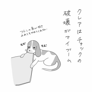 こんにちは、水無月です。イングリッシュコッカースパニエル2匹と暮らしています。日常を絵日記(エッセイ漫画)として投稿しています。ぜひご覧ください!◾️クレア本当に器用に金具(スライサーというらしい)が取り外されて床に落ちてる。食べてないだけ偉いと思うしかない。破壊され慣れてきて発見次第「やってんなあ」だけで済んでたのに、ベッドのスポンジまで破壊されてた時は流石に時止まった。なぜ自分の寝床を破壊するのか。