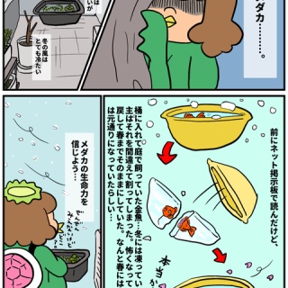 寒すぎてたまーに水槽の表面に氷の膜がはってるし、メダカ達はずーーっと底に隠れてるのか姿が全然見えない!生きてんのかー!?泣‼︎⁉︎一応去年も冬を越したメダカ達だから大丈夫だと信じたい‼︎ネットで見た金魚の話は衝撃的だったけど、私に勇気をくれました…わたしが作った陶芸やZINEを販売しています。よかったらのぞいてみてね!https://chyoki.base.shop/LINEスタンプも販売中!https://store.line.me/stickershop/product/25550253/ja