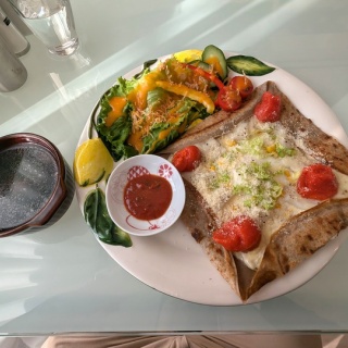 今回は「ガレット(もち・めんたいこ・チーズ・コーン・玉子)/1200円(税込み)」 +「黒酢はちみつジュース/350円」