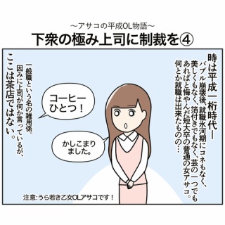 【下衆の極み上司に制裁を④】アサコの平成OL物語でございます。まだハラスメントが世の中にそんなに浸透していなかった平成初期…上司の発言や行動に疑問を感じつつ耐えながら仕事をしていました。さっさと辞めればよかったですよね…*最後までお読みいただき感謝申し上げます!また遊びに来てください!アサコ