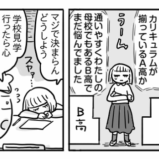 公式LINEがリリースされました!友達登録してね~♪↓友達登録はこちらから↓https://lin.ee/WYjaveG登録者2000人突破しました!ありがとうございます♪前回はこちら↓ 久々!受験生すーちゃん続報です この話を最初から読む★いよいよ受験生生活も本格化?受験話です! 無事部活も引退しまして今はもうじき三者面談で私立の願書を出すところですが漫画はちょっと前の話から振り返っておりますすーちゃんの第一志望1年生の時から気になってたA高と最近急上昇してきたB高でずっと揺れていました(B高はわたしの母校) ↑最初は絶対B高だけはないと言ってたけど…オープンスクールに行けば心が決まるかと思ったけど余計にどっちもよく見えてしまって決まらない……なので、一旦落ち着いてそれぞれの学校について紙に書き出してみることにしました次回へ続きます ★電子書籍出ました★ブログのまとめ本になります!「ひとり親生活」についての漫画をまとめて読みやすくなってます是非覗いてみて下さい♪★お好きな方法で読者登録してね♪★↓LINE友達登録はこちらから↓https://lin.ee/WYjaveG↓アプリでの読者登録方法↓★本格サーキットのISKさんで漫画を描かせていただいています★★新刊情報★Amazonレビュー100件超え!★4.8の高評価本当にありがとうございますTwitter(X)で2話まで試し読み公開中!こちらをクリック→★4/2新刊出ました!Amazonリンクこちら↓99%離婚 離婚した毒父は変われるか龍 たまこKADOKAWA2024-04-02電子版はこちら↓99%離婚 離婚した毒父は変われるか【電子限定カバー版】 99%離婚 モラハラ夫は変わるのか (LScomic)龍 たまこKADOKAWA2024-04-02Amazonレビューなどつけて頂けると励みになります♪ピッコマはこちら!↓試し読みも出来ますよ~♪読者登録もよろしく!★Amazonレビュー1000超えました~★ありがとうございます~!評価★4.6‼まだの方は是非~♪ピッコマではすぐ読めますー!インスタはこちら★ピッコマでは3話無料! お仕事依頼についてはこちら