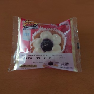 今日もローソンと「神業チャレンジ」と言うテレビ番組のコラボ商品こちらは梅沢富美男さんが考案したらしいです。こんな感じ↓果肉感を残したブルーベリーにクリームをお花模様にトッピングしたポピーシードケーキ。ポピーシードはケシの実のこと。見えにくいけど、スポンジに付いている黒い小さい粒がそうです。ぷちぷち食感がなかなかハマるケーキはしっとり…。味は悪くないブルーベリーソースはあまり酸味はなく甘めかな。でも、これは好きかもしれない
