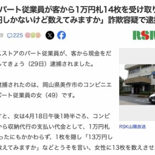 【岡山】コンビニでパート従業員の女(49)が客から1万円札14枚を受け取り1枚を隠す「13万円しかないけど数えてみますか」詐欺容疑で逮捕