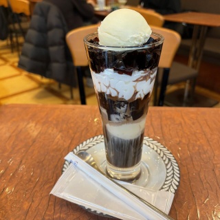 再開発が着々と進んでいる横浜駅周辺。ニューマンやTHE YOKOHAMA FRONTなど現代的な商業施設が次々とオープンしていますが、そんな中でも庶民的というか、歌舞伎町的な雰囲気を残しているのが五番街エリア。立ち食い蕎麦屋や小さな飲み屋が乱立してて、ドンキの辺りには高校生がたむろしていて、全く別の顔を見せています。 その五番街の入り口にある喫茶店が横濱珈琲店 五番街。創業は1965年の老舗。横長の建物全体を西洋風の柵で覆ったデザインがおしゃれで格式を感じさせてくれます。雰囲気に押されて初めての時は入るのに躊躇しましたが、店内は雑多な雰囲気。常連さんらしきご年配の方から若手、井戸端会議、サラリーマンまで多彩な層が集っています。 それもそのはず、今ではすっかり珍しくなった全席喫煙OKじゃありませんか。これなら横浜周辺の愛煙家が集まるわけだ。そんなわけでタバコが苦手な人はご注意ください。 そんな中で2階のテーブル席に着いた私は何を注文するか。珈琲店を名乗ってるからコーヒーは飲みたい。でもデザート系も食べたい。そう思いながらメニューを見ていると、ドンピシャのコーヒーゼリーパフェがあるじゃないか。コーヒーも味わえるパフェ。最高です。 こじんまりしたサンデー的なものを想像していましたが、出てきたコーヒーゼリーパフェの本格的なこと!背の高いパフェグラスの中には上からバニラアイスクリーム、コーヒーゼリー、生クリーム、コーヒーゼリー、バニラアイス、コーヒーゼリーという魅惑のコンビネーション。気合いを入れて食べるやつです。 でも思った以上に食べやすい!コーヒーゼリーは甘すぎずに苦み走った味わい。生クリームとバニラアイスの甘さでちょうどよく落ち着きます。気がついた頃にはぺろっと完食。これなら別でコーヒーを注文してもいけたかも。。。次行ってみよう。
