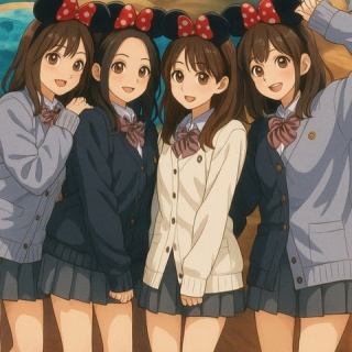 テーマパークの海の世界を背景に、制服姿の女子高生たちが仲良くポーズを取るアニメ風イラストです。ミニーの耳カチューシャをつけた4人の少女が、友情と青春の輝きを感じさせる笑顔を見せています。柔らかなセル画調の色合いと繊細な線画が、温かく楽しい雰囲気を演出しています。An anime-style illustration of five high school girls posing happily in front of an ocean-themed amusement park backdrop. Wearing matching school uniforms and Minnie-style ear headbands, they radiate the warmth of friendship and youthful energy. The soft cel-shaded coloring and delicate linework bring out a cozy, joyful atmosphere reminiscent of classic anime scenes.