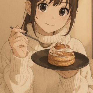 大きな瞳が印象的な可愛いアニメ風の女の子が、ほっこりとしたカフェでスイーツを楽しんでいます。クリーム色のタートルネックセーターを着て、フォークとデザート皿を手にした姿が魅力的。木のテーブルにはハート型のラテアートが添えられ、暖かみのある色調と柔らかな光が、秋のくつろぎや季節感をテーマにした作品にぴったりです。A cute anime-style girl with large expressive eyes enjoys a dessert at a cozy café. She wears a cream-colored turtleneck sweater and holds a fork and pastry plate. A latte with heart-shaped art sits on the wooden table. The warm tones and soft lighting create a relaxing autumn atmosphere, perfect for themes of comfort, food, and seasonal charm.
