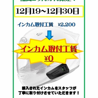 実は 福岡2りんかん限定で・・・ 12月19日~30日にお得なキャンペーンがあります!! 当店で『インカム』をご購入いただいたお客様は なんと・・・インカム取付工賃が無料です!! 歳末セールとご一緒にいかがでしょうか? ※お取り付けにはお時間いただく場合がございます。 ※当店でのご購入以外の品は取付工賃¥4,400(税込)となります。 ぜひ、ご検討くださいませ。 ☆★☆★☆★☆★☆★☆★☆ 福岡2りんかん 福岡県福岡市博多区半道橋2-2-8 ラウンドワン1F TEL 092-477-3177 ☆★☆★☆★☆★☆★☆★☆