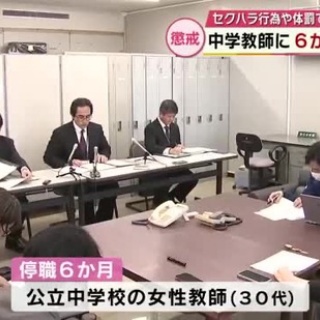 1: 匿名 2025/12/20(土) 15:55:49.04 ID:KP28psCS0 BE:917589786-PLT(16000) 勤務する中学校の男子生徒と不適切なやり取りをしたなどとして、大分県教育委員会は、19日付で公立中学校の女性教師を停職6か月の懲戒処分としました。 このほか、同僚へのハラや児童への体罰で男性教頭や男性教師も懲戒処分を受けています。 ◆県教委神屋貴志 教育人事課長 「大変申し訳ありませんでした」 19日付で停職6か月の懲戒処分を受けたのは県内の公立中学校に勤務する30代の女性教師です。県教委によりますと、この女性教師は2025年5月ごろから7月ごろにかけて、貸与されているタブレットなどを使い、勤務先の中学校の男子生徒1人と不適切な内容のやり取りをほぼ毎日、繰り返していました。 また、教室で2人きりになったり、休日には自分の車に乗せて飲食店や商業施設を訪れ、生徒への身体接触もあったということです。 女性教師は19日付で依願退職しています。 このほか、公立中学校の50代の男性教頭が同僚の女性職員にハラ行をしたとして停職1か月に、日田市の小学校の20代の男性教師が児童に体罰をしたとして、減給10分の1・3か月の懲戒処分をそれぞれ受けています。