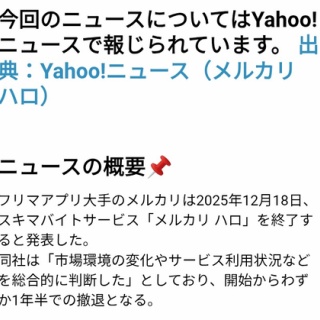 ※アフィリエイト広告を利用しています。今回のニュースについてはYahoo!ニュースで報じられています。 今回の事件についてはYahoo!ニュースで報じられています。 "> 出典:Yahoo!ニュース(メルカリ ハロ) ニュースの概要📌フリマアプリ大手のメルカリは2025年12月18日、スキマバイトサービス「メルカリ ハロ」を終了すると発表した。同社は「市場環境の変化やサービス利用状況などを総合的に判断した」としており、開始からわずか1年半での撤退となる。---経緯と背景📌「メルカリ ハロ」は、2024年3月にスタートしたスキマバイトマッチングサービス。空いた時間に短時間で働けるバイトを探せることから、若年層を中心に注目を集めていた。メルカリでは、バイトで得た収入を同アプリ内での買い物に使うといった“循環型経済”を目指していた。登録者数は1,200万人を超え、急拡大をアピールしていたが、実際に働いたユーザー数など詳細データは公表されていない。背景には、スキマバイト市場で競合する「タイミー」「ショットワークス」「LINEバイト」などとの競争激化がある。特に人手不足業界では求人媒体が乱立しており、企業の掲載コストが上昇。メルカリとしても採算性を維持するのが難しくなっていたとみられる。---関係者・専門家のコメント📌人材業界関係者の一人は「メルカリ ハロは知名度の割に実稼働率が伸びなかった。スキマバイト市場は参入障壁が低い一方で、求人側の確保が難しい」と指摘する。また、ITビジネスアナリストの小林翔氏は、「メルカリは本業であるフリマアプリ事業の安定化や、海外展開に注力しており、周辺サービスの見直しは経営的に妥当」と分析している。一方で、「メルカリ ハロ」が築いた登録基盤やノウハウは、今後の新規サービスや提携事業に活かされる可能性があるとも見られている。---世間の反応📌SNSでは、終了発表に驚く声が多く見られた。「意外と早かった」「使おうと思ってたのに」「便利だったのに残念」など、ユーザーからは惜しむコメントが相次いでいる。一方で、「そもそも存在を知らなかった」「タイミーのほうが使いやすかった」といった反応も少なくなく、認知度や差別化の課題が浮き彫りとなった。Yahoo!ニュースコメント欄でも、「メルカリらしいスピード感だが、継続より撤退判断の早さが印象的」「人材マッチングは参入企業が多すぎる」といった冷静な分析が目立った。---今後の見通し・影響📌メルカリは今後、介護・医療などの求人を探す利用者に対して、提携先のベネッセキャリオスが運営する「キャリオス1DAY」の利用を呼びかけている。スキマバイト市場全体では、短期人材の確保をめぐる競争がさらに再編へ向かう可能性がある。企業の人手不足を解消するサービスは依然として需要が高く、AIマッチングや即日払いシステムの導入など、新たな付加価値が求められている。メルカリにとっては、コア事業の収益力強化と経営効率の見直しが今後の焦点となりそうだ。---まとめ📌メルカリがスキマバイト事業から撤退する背景には、市場競争の激化と採算性の課題がある。短期人材マッチング市場は成長を続けるが、今後は差別化と持続可能なビジネスモデルが問われる時代に入っている。メルカリの次の一手に注目が集まる。---【第2類医薬品】命の母A 840錠小林製薬2015-06-30 事件・事故ランキング ひとりで自分資産はつくれる 52歳からお金を貯める・増やす