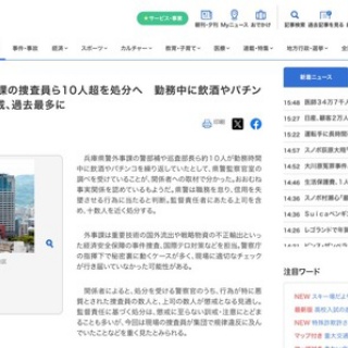 【兵庫県警】勤務中に酒飲んだりパチンコ屋に行ったりしていた警察官ら10人以上を処分へ