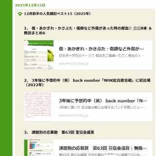1. 傷・あかぎれ・かさぶた・傷跡など外傷があった時の献血日記8本 & 教訓まとめ6 2. 3年後に予想的中(笑) back number「NHK紅白歌合戦」に初出場(2022年) 3. 課題別の応募数 第63回 宣伝会議賞 4. 「 宣伝会議賞雑感 」の目次( 一次審査通過・二次審査通過・おすすめ記事・連絡・チャレンジブログなど ) 5. 【献血】あと10回で2026年までの目標達成 6. 【月間】宣伝会議賞テーマの人気雑記5(2025年11月) 7. 一次・二次・三次審査通過しそうな課題テーマの雑記まとめ 第63回 宣伝会議賞 8. 切れ痔(?)がありつつ成分献血へ 9. それくらいの柔軟性が物語にはある 宇宙のあくび【319】 10. 【月間】NHK紅白歌合戦テーマの人気雑記ベスト3(2025年11月) 11. 献血ポイント交換記念品(グッズ)写真まとめ ~ハンドソープ / 除菌ウェットシート / 救急セット / ミニボックスティッシュ / 入浴剤 / アルコールハンドジェル / 食器用洗剤… 12. 今年ラストのサイクリング? 13. アクセス上昇! back numberテーマの雑記 【NHK紅白出場】 14. 献血帰りに献血運搬車 15. 模試採点バイト・在宅採点の日記 / 感想 / 採点数( 2006・2021~2025年 )【 会場・完全在宅ワーク/フルリモート 】