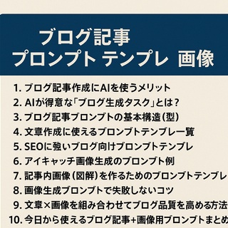 【完全ガイド】ブログ記事を効率化するプロンプトテンプレ&画像生成テクニック ブログ運営において、「記事を書くスピードが伸びない」「画像を用意するのが大変」と感じる人は多いものです。特に最近はAIツールが進化し、文章生成だけでなく、アイキャッチ画像や図解までAIで作成できるようになりました。しかし、AIを十分に活用できていない人もまだまだ多いのが実情です。 この記事では、ブログ記事作成を最短化するプロンプトテンプレートと、画像生成を成功させるためのプロンプト例をまとめて紹介します。「何を書けばAIが正確に理解してくれるのか」「どんな指示をすると画像のミスマッチが減るのか」を、誰でも再現できる形で解説していきます。 ■ ブログ記事作成にAIを使うメリット AIを使う最大のメリットは、「ゼロから作業を始める負担が減る」ことです。 記事構成を提案してくれる 導入文やまとめを高速で作成できる リサーチの代行になる 文章の書き換え・リライトも自在 特に毎日ブログを更新する場合、AIが“下書き”を作ってくれるだけで時間と労力が大幅に軽減します。 ■ ブログ記事プロンプトの基本構造(型) AIに正確に書かせるには、「曖昧さ」をできるだけ排除することが重要です。 以下の プロンプト構造(型) を使うことで、ブレの少ない文章生成が可能になります。 【ブログ記事プロンプトの型】 目的(何のために生成する?) 読者層(誰に向けて?) トーン・文体(丁寧/カジュアル/専門的) 構成(見出し案) 文字数 SEOキーワード 避けたい内容・含めたい内容 この型さえ守れば、どのAIでも高品質なブログ記事が生成できます。 ■ そのまま使えるブログ記事プロンプトテンプレ 以下はブログでよく使うテンプレです。 ▼ ブログ記事生成テンプレ 以下の条件でブログ記事を書いてください。 ●目的:読者の悩みを解決する記事 ●読者:ブログ初心者、Webライター、個人ブロガー ●文体:丁寧、わかりやすい日本語 ●文字数:2000〜2500文字 ●SEOキーワード:「ブログ プロンプト」「AI 文章生成」「ブログ画像 生成」 ●構成:導入→問題→解決策→具体例→まとめ ●NG:専門用語の多用、抽象的な説明 ▼ リライト用テンプレ 以下の文章を、意味を変えずにより読みやすく、SEOに強い形にリライトしてください。 ■ AIでアイキャッチ画像を作るプロンプトテンプレ 画像生成AIは「曖昧表現」が苦手です。 たとえば「きれいな画像」「雰囲気のある写真」などは具体性がなく、期待した仕上がりになりにくい傾向があります。 以下のプロンプトを使うと、完成度が大きく向上します。 ▼ アイキャッチ画像用プロンプトテンプレ ブログのアイキャッチ画像を作成。 横幅1000px、16:9。 テーマ:「〇〇(記事タイトル)」。 シンプルで読みやすいデザイン。 日本語タイトルを中央に配置。 背景は淡いブルーと白の組み合わせ。 ▼ 記事内の図解(インフォグラフィック)用テンプレ ブログ用の図解画像を作成。 内容:「〇〇を3ステップで解説」。 アイコンを使用し、シンプルなカラーリング。 横幅1000px、視認性の高いレイアウト。 ■ 画像生成プロンプトで失敗しないコツ AI画像生成は「情報量」と「指定の明確さ」で品質が決まります。 成功のポイントは3つ サイズと比率を必ず指定する(例:1000px、16:9) 色・雰囲気・構図を具体的に書く 不要なものを書く(不要な要素を排除する) 例:「人物は含めない」「文字以外の装飾は最小限」 ■ 文章 × 画像でブログの品質は劇的に上がる 文章だけのブログよりも、AIで生成した画像や図解を挿入した記事のほうが、 記事の滞在時間が伸びる SNSでシェアされやすい 視覚的に理解しやすくなる 検索エンジンの評価が上がりやすい というメリットがあります。 画像生成AIを活用すれば、外注費なしで高品質なビジュアルが手に入るため、 個人ブロガーにとっては大きな武器となります。 ■ まとめ:テンプレを使えばブログ作業は劇的にラクになる AIを使ったブログ運営のポイントは「プロンプトの質」です。 しっかりしたテンプレを使えば、記事作成も画像作成も、 これまでの半分以下の工数で実現できます。 この記事で紹介したプロンプトテンプレをそのまま使えば、毎日のブログ更新が圧倒的にラクになります。