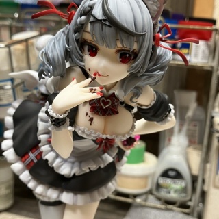 最近めっきり涼しくなって過ごしやすい季節が続きますね♪ありがたいこってす。どうも、僕です。ここ数年「秋ってあったっけ?」って感じで10月過ぎてもクソ暑くて一気に寒くなる状態でしたが、今年は違う!エアコン使わなくても快適な気候がそこそこ続いております。まさに『秋!』ずいぶんと前から「異常気象だ!」「地球温暖化だ!」とわーわー騒がれてきましたが、感覚的には一年通して暑いターンが終わって寒いターンに入って来たって気分。なんでも地球って数十年周期で寒いのと暑いのを繰り返してるらしいすね。太陽との周回軌道の関係だとか。「CO2がー」とか「環境破壊がー」とかで所詮人間ごときの所業が地球レベルで影響を及ぼすよりも、そんなもんすっ飛ばして天体レベルの力でねじ伏せられてる、っての方が納得出来るってもんです。さぁ、それでは早速クロヱさんの彩色やって行きましょう〜♪もちろんプライマー+クリアーでつるっつるぴっかぴかの塗装下地から。そうよね、フツーはパーツ数これ位よね(汗)。ハイカロリーキットを沢山やってると逆に少なく感じて不安になっちゃう…。組んじゃうと完全に見えなくなってしまうパンツの色からご相談。「好きにしちゃってください」って事になりました(笑)。もちろん最初は肌塗装から。今回は作例写真を見本とするオーダーですので、結構しっかりめのオレンジ系。当方秘伝のタレ+クリアオレンジです。最近は「ほとんど色ついてないんジャマイカ?」って位色白薄め肌が多いので、久しぶりにしっかり肌塗ったっぞ!て実感が♪タイツとかフリルとかエプロンとかの白系はくくりグレー+クールホワイト+クリアバイオレットからのスーパーホワイト。微調整するだけでオールマイティーに白系のシャドーになるのがくくりグレーの良い所♪写真には写り切れてませんが、結構しっかりグレーシャドー入れてます。そんでもって赤い部分はシャインレッド+レッド+純色ダウナー。更にクリアーブラックで陰影を大げさ目に表現。これも作例でそうなってますのでね〜。レッドだけよりかちょっとだけ黄色みがあったので、シャインレッドから調色スタートしました。さぁさぁやって参りました!久々のチェック塗装でございます!マスキングを何回も重ねて行くので、まずはベースをしっかりマスキング。テープで塗り分けを繰り返す時は厚めにクリアー塗って強力コーティングしとくのが定石。細切りマステの3.0mmとか0.7mmとかを駆使してラインを作り、その脇をマスキングして細切りマステを外すと塗り分けライン完成とな〜。これ、いきなり塗り分けラインを作ると大体失敗します(笑)。特にモールドやアタリのない時はまず模様をマステなりなんなりで作ってバランスを取り、完成のイメージが出来てからその余白を埋めて行くのが安全でございます。ドヤァ!!いやまだドヤる所じゃない(笑)。この配置に結構時間かかっちゃいましたね〜。と言うのも上にかかる黒スカートの隙間から見える部分ですので、中々太さと隙間のバランスが難しくて…(汗)。黒はもう一層重なるのでやり過ぎ注意!「ちょっと薄いかな〜?」位で十分。そんなこんなで横ラインも入りました♪重なった部分が濃くなってギンガムチェックの雰囲気が出てきましたな♪今度は白ラインです。0.4mm。市販の細マステでは最細かな。隙間も0.4mmです。縦ラインで1層、横ラインで1層。格子状に切り出して1回で済ます方法もありますが、角の整形に時間かかった割に結果ヨレたりズレたりするので、縦横の重なり部分を濃くしたくない場合以外はあっさり縦横で層を重ねた方が早くてキレイです。そんで各々の色を全体的に馴染ませるようにクリアカラー系を軽くかけるとしっくり落ち着きます。今回はクリアーブラックで馴染ませました。上の黒スカートと合わせるとこんな感じ〜♪うん、100点満点!♪同じく首のリボンもギンガムチェック〜。対象が小さいので線幅も細いバランスで。とりあえず格子状までチェック塗装完了!白のラインは後ほど筆で描きます。流石にね(笑)。黒部分も塗り分け完了〜!布部分はくくりグレー+ウィノーブラックで黒めのグレーで一旦塗装してからクリアーブラックで黒く追い込み。黒塗装は今の所コレが最適解すね(自分的に)。でベルトはウィノーブラック単色です。同じ黒系でもアクセント的に違いをば。猫耳カチューシャは何気に多色使いです。耳の外側は白目のグレー、内側がピンク、もふもふはソリッドの黒を先端にかけて造形のエッジ出ししてます。チョコは水玉ドット模様で。ここは作例とは変えて濃いピンクと薄いピンクのツートンです。スーパーホワイト+純色マゼンタ。ラッピングのリボンはエナメルのブラウンで後ほど筆描きします。髪はくくりグレーをコバルトブルー+スーパーホワイトで青白に寄せての薄グレーです。ここでも活躍くくりグレー(笑)。かなり髪の造形が深く細かいので凹部にシャドー入れるの大変でした(汗)。そんで前