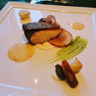 初めて訪問しましたが 立派なテーブルクロスのお席がゆったり配置されていて いかにも歴史があって高級そうです。 教科書に載ってる高級レストランって風情あり。 名士が集ってうんちくを語るのが似合いそう。 最初に 「お時間制限ございませんか?」 って聞かれた。相手に合わせてくれるんだね。 葡萄ジュースが濃くて濃くて ワインみたいにチビチビ飲んだ。 ポリフェノールがいっぱい摂れたであろう。 本日は前菜とスープとメイン、デザートは食べ放題のコース。 もちろん一休プランでお得にしていただけました☆最大53%OFF!高級レストランをお得に予約! 前菜はスズキを使った一品。 美味しいですよ~😋 皮部分の焦げがまた風味を増してくれる! お野菜もいっぱい。 クロワッサン持ってきてくれました♪ 外サクサクで美味しい(^^) 蕪のスープ。しっかり蕪の味がしてあっさりなのにクリーミィ。 ドライベーコンがちりばめられていてパンチ効いてます。 胡桃パン、胚芽パン、フランスパン。焼きたて!って感じではないけど柔らかくて美味しいです。 メイン~♪ 鰤のポワレ・マスタードのクリームソースとほうれん草のソース。 皮だけ揚げたみたいにパリパリで香ばしく、美味しくいただけて、 身は柔らか~くてホロホロジューシーですよ。 よく知ってる鰤の味ですが、お上品で美味しい! 芸術的~ さすがです。 そしてデザート!♪ デザートはワゴンでいっぱいの種類を持ってきてくれます♪ 選べない! とりあえず全種! 手前のはフレンチトーストですよ~パンがプリン化しているのかプリンがパン化しているのか?!という状態。甘すぎなくて美味しい。 リンゴのタルトもリンゴがジューシーで控えめカスタードと相まって美味しい。 プリンもブリュレみたいに滑らかクリーミー。 食べ放題なのでお代わりいかが?って聞いてくれて 1回目にはなかったエクレアなどが!!! ・・・素敵♥ まだいけてしまったので再び 「全種」 で・・・・ ちょっとずつ、チョコレートやらチーズやらカラメルやら いろんな味が楽しめてテンション上がりすぎる~~~ 羊羹なみにぎっしり詰まったフルーツケーキが美味しかったな~ (全部美味しいですよ!) ホットコーヒーにした♪ お砂糖までゴージャス~ セレブ気分になれてよかったです。 また行こうっと。 (2018年12月)