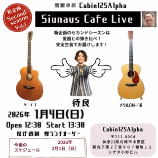 マスターごろーから明日のランチメニューのお便りが届きました。それではさっそく発表です!☆パスタランチ☆アサリとカブとトビッ子のペペロンチーノ 柚子の香り☆ピザランチ☆合鴨の照り焼きと九条ネギの温玉ピザ☆ごはんらんち☆キチンの猟師風煮込み悩む…どうか楽しみにいらしてください♪明日は2025年から始まった新企画の第12弾!残すところあと1回となりました。ミュージシャンの牟田靜氏の監修のもと、毎月ごとに使用ギターが代わります。第12回はふたたびのサカタギター。ギターの詳細は下記をご覧ください。ほぼ生音だからこそ実現できる、極上のアコースティックギターのサウンドを、ゴローさんの料理とともにお楽しみください。待良企画 Siunaus Cafe Live!◆日時 2025年12月28日(日) 12:30開場 13:30開演 17:00閉店◆会場 JR武蔵小杉駅北口徒歩2分 Cabin125-Alpha 【住所】〒211-0004 神奈川県川崎市中原区新丸子東2-907 シゲタ小杉ビル2階 【電話】044-411-8140 写真付きの行き方はこちら ◆料金:投げ銭制 要ランチセットオーダー ◆出演:待良 ギターの紹介(オーナー 牟田靜氏筆)カレー&喫茶専門店を経営しインディーズ・レーベルを立ち上げ、自らも自主制作でのアルバムをリリースしている経歴を持つ山梨県甲府市にて工房を構える個人製作家の坂田ひさし氏。2001年に最初のギターを完成させて、2005年に"TOKYOハンドクラフト・ギター・フェス"に初出品を果たす。マーティンやギブソン・スタイルのボディースタイルを基本に、JモデルやSJ及び国内では珍しい13フレットジョイント仕様等も手掛け、高品質のギターをコンスタントに製作。国内はもとより海外でのギターショップも取扱をはじめ、人気製作家として近年広く知られております。(使用ミュージシャン:友部正人、宮田和弥、寺岡呼人、河口修二、PETA、いとうたかお、有山じゅんじ、よしだよしこ、いわさききょうこ、常富喜雄、他多数。<順不同、敬称略>)その坂田ギターのOM-28Bというモデルです。サイドバックがハカなのに表はアディロンではなくシトカ。この組み合わせのほうが歌唄いにはあっているとか。ほかのルシアーさんや工房ギターでハカとアディロンの組み合わせは持っていますが、音が立っている。リードギターを弾くとかバンドの中で音が埋もれないだとかの目的だと最高の組み合わせなのかもしれません。がっ・・しかし、歌唄いにはこのハカにあえてシトカ。あっていると思うのですが。声質にもよりますが僕は歌いやすい。声とギターの音色のハーモニーを楽しんでください。25年大トリの1本です。TOP: Sitka SpruceSIDE&BACK: Brazilian RosewoodNECK: Honduran Mahogany (1-Piece / U-Shape)FINGER BOARD: Ebony (Original)BRIDGE: Ebony (Original)TRIM: Black and White Cell / IvoroidPICK GUARD COLOR: Tortoise (Original)POSITION MARK: DotsTUNER: Gotoh / Open-Gear / Nickel (Original)BRACING: Original-XNUT WIDTH: 44mmSCALE: 648mmOTHERS 1: Lacquer Finish / AJ Neck RodOTHERS 2: Hand Made Custom Guitar / Made In JAPAN