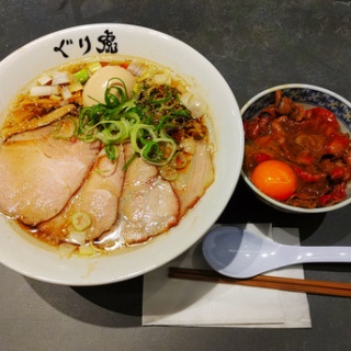一宮市新生に12月オープンした、ぐり虎食堂 一宮店を訪れてみました。JRと名鉄の一宮駅を束ねるターミナルステーション内でも西口寄りで、名鉄百貨店跡に2025年12月誕生したばかりの新商業施設イチ*ビル地下1階にある飲食街でも、アミューズメント店舗に隣接するところにお店を構えます。イタリアンシェフでありながらもラーメン店で修業を積んだオーナーが、2017年に岡山にて麺処ぐり虎を開業しました。そして2022年には名古屋の栄に出店したのを皮切りに、名古屋エリアにて複数店舗を展開し、一宮にぐり虎食堂をオープンさせました。店内は、曲線を描くようなU型のカウンター席が設けけられ、スタイリッシュでシックな都会的な佇まいです。カウンター席のほかにテーブル席もあります。こちらもライトの灯りや間接照明の照らし方が印象的で、ムーディーでお洒落な雰囲気を醸し出しています。オーダーは、入口横に設置された券売機にて、先にお支払いを済ませることになります。番号が記載された整理券を受取ると同時に、オーダー内容がキッチンへ伝わるシステムです。メニューは、濃厚豚骨魚介や旨辛のつけ麺、鶏塩・赤い鶏塩・熟成醤油・赤辛熟成醤油のラーメン、まぜそば、旨い辛まぜそばがあります。お好きなラーメンにサイドメニューがセットできる得セットが用意され、黒毛和牛の焼きすきごはん、からあげ、レアチャーシュー丼、炙りてりマヨ丼、明太ごはんのセットが用意されています。ラーメンで使用する熟成醤油ダレと打ち粉で仕上げたからあげの定食が、まだ準備中ですが、メニューにあります。ぐり虎の学割と名付けられた、麺大盛無料orごはん無料となる学生さんに嬉しいサービスも実施されています。また、つけ麺やまぜそばは、いつでもどなたでも、麺の大盛や特盛が無料となります。なおラーメンについては、平日のランチに限り、麺の大盛が無料でいただけます。期間限定メニューの用意もあり、寒い季節にぴったりな濃厚豚骨魚介ラーメンの扱いが冬季限定にてあります。ごはん・追い飯・替え玉(半玉or1玉)については、お席から追加オーダーも可能です。生卵と海苔については、ご自由に店内にていただけます。無料の卓上トッピングとして、ラーメンスパイス、シビカラスパイス、ふりかけが、お席に備え付けてあります。特製熟成醤油ラーメン(1150円)、黒毛和牛の焼きすきごはんセット(+550円)をいただくことにします。※焼きすきごはんの生卵は無料サービスのものを使用。特製熟成醤油ラーメンは、チャーシュー4枚、煮玉子、メンマ、青ねぎ、刻みねぎが具として入っています。チャーシューはレア気味のもので、柔らかさとともに肉感もあり、ラーメンのスープや麺にしんみりなじみます。スープは醤油由来の旨コクが感じられる味わいで、コシのある麺や具との絡みも良く、美味しくいただけます。黒毛和牛の焼きすきごはんは、タレを染み込ませて焼き上げた牛肉をごはんに載せた、すき焼き風ごはんです。牛肉は赤身が程よく残ったレア仕上げで、無料サービスの生卵を絡めながら、濃厚なタレになじんた牛肉の旨みを味わえます。名古屋でも話題を集めるぐり虎のラーメンが、一宮でもいただけるようになりました。一宮駅周辺で美味しいラーメンを食べたいときには、候補にしておきたいお店です。