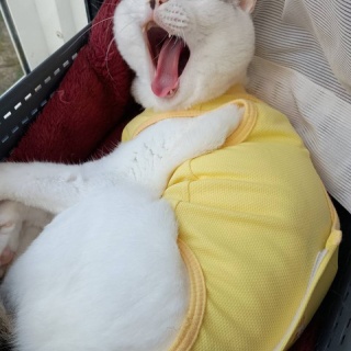 ポン太、術後着を脱ぎ捨てて。と、イエロー花びらのドレス作りました。