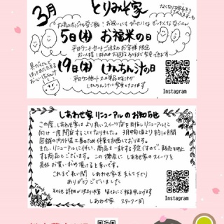 とりみそ家・しあわせ家★3月のイベント情報【リニューアルOPEN スイーツ ランチ お福米 豆ごはん けんちん汁 とりあみ焼き 明和 三重県 レジャー】