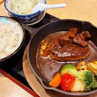 池袋のハンバーグ 216軒目 池袋「牛たん炭焼 利久 エソラ池袋店」のハンバーグを食す 「牛たん炭焼 利久 エソラ池袋店」 大きな牛たんシチューハンバーグ定食 (麦飯・テールスープ付き) 1,683円(税込) 鉄鍋の中、牛たんとハンバーグの共演です。 この「大きな牛たんシチューハンバーグ定食」が食べられるお店は「牛たん炭焼 利久 エソラ池袋店」。 「牛たん炭焼 利久」は、宮城県仙台市に本店を構える牛たん専門店です。 「牛たん炭焼 利久 エソラ池袋店」は、東京メトロ池袋駅と直結の「エソラ池袋」の7階にあります。 店頭のメニュー。 定番メニューの牛たん定食は、牛たん2枚4切で1,936円(税込)から。 私はもちろんハンバーグ。 箸袋やお手拭きがお店のロゴ入りだと、嬉しくて撮影してしまいます。 さてさて来ました、大きな牛たんシチューハンバーグ定食。 ごはんは麦ごはん。 牛たんに欠かせないテールスープも付いてきます。 ハンバーグに絡まる牛たんシチュー。 コクありです。 付け合わせはニンジン、ブロッコリー、レンコン、サツマイモなど色鮮やか。 シチューの中の牛たんは「大きな牛たん」の名に恥じない大きさ。 牛たんシチューって、誰が考えたんでしょう。 思いついた人、偉い! 公式:https://corp.rikyu-gyutan.co.jp/ 訪問日:2025年11月 ※料金などの情報は訪問時のものです。 食べログ > 牛たん炭焼 利久 池袋店
