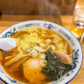 町中華のラーメン巡り。今日は駅の南側、花水台にある「藤」さんへ。前回の訪問は8年前。2回目です。赤い看板や幟、暖簾、テントルーフ、足拭きマットが目印の中華料理店です。駐車場は少し離れた場所にあります。壁にはドーンとメニューが掲示されています。たくさんの料理がいただけそうです。店内は広く、カウンター席・テーブル席があって、オープンキッチンからの湯気で気分が盛り上がります。それにしても綺麗で、掃除が行き届いている感じがありました。まずはビール(中)【550円】で喉を湿らせます。キリンかアサヒが選べました。そしてタンメンと悩みましたが、ワンタンメン(750円)を注文しました。まず、ビジュアルが素敵です。黄金の油が浮いた透明な茶色のスープに黄色のワンタン・淡い茶色のメンマ・半分沈んだチャーシュー・白ネギが茶色系のグラデーションを作り、ワカメとなるとが色彩アクセント。青い龍の丼が周りを引き締めています。さて、スープは鶏出汁が効いてる優しい味の醤油。ちょうど良い量の鶏油が香りと味のパンチをくれます。ブラックペッパー投入でキリッとした味に変化します。ワンタンの皮は比較的厚め、餡は握りが柔らかめで胡麻油の香りが全体の食欲をそそります。チャーシューは噛みごたえがある中厚のロース。あっさり目のちょうど良い味付けが良き。麺は中加水中細若干ウェーブ麺。歯切れのよいコシがあり、香り良いものです。スープとのバランスが抜群。ごちそうさまでした!後から入店してきたお客さまが「ワンタンメン辛口!」と注文していました。え?辛口あるの?それいいじゃん。裏ってやつですね。丼デザインはこれに似ていますね。丼の内側に「藤」って赤い文字がプリントされていて、トラディションを感じました。--藤神奈川県平塚市花水台33-6