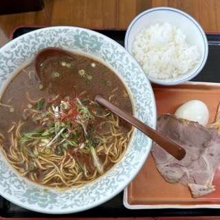 <実食 2025/04> チャーシュー麺 醤油 チャーシュー1枚+プチライスを注文しました。 こちらのお店に行ってきました。 『柳麺 幻(げん)』さん 蘭越町の人気店です。 以前は店名が『麺工房』『えぞらーめん勝二』、そして今回の『柳麺 幻』に変更になっています。前回訪問したのは『麺工房』の頃、2005年なので20年ぶりになります。 お店の奥に『えぞらーめん勝二』の頃の暖簾がありましたよ。 店内はカウンター、テーブル、小上がり。 メニューは「チャーシュー麺 半熟卵+メンマ付き」で「味噌」「塩」「醤油」「こく塩」「カレー」から味を選択、チャーシューの枚数を選択するシステム。伝票に記入して支払いは前払い。 自分は「チャーシュー麺 醤油 チャーシュー1枚」+「プチライス」、同行者は「チャーシュー麺 こく塩 半麺 チャーシュー1枚」をお願いしました。 「チャーシュー麺 醤油 チャーシュー1枚」+「プチライス」 具は別皿でのセパレートタイプ。 「チャーシュー麺 醤油 チャーシュー1枚」 まずはそのまま頂きます。スープは動物系メインの旨味に醤油ダレが効いた味わいでなかなか美味しい。 麺は須藤製麺さんの細めのウェーブ、やや加水率低めな印象で、ほんのり旭川っぽさも感じます。 具はチャーシュー、半熟卵、メンマ、ネギ、糸唐辛子。 途中でラーメンに乗せて頂きました。 「プチライス」 そのまま食べるも良し、「薬味の説明書」を参考にチャーシューを乗せて、タレや青唐味噌をつけて食べるも良し。 同行者の「チャーシュー麺 こく塩 半麺 チャーシュー1枚」 こちらもまずはそのまま頂きます。スープはマイルドで独特のコクのある味わいでなかなか美味しい。 麺は同じく須藤製麺さんの細めのウェーブ。 具はチャーシュー、半熟卵、メンマ、ネギ、糸唐辛子。こちらも途中からラーメンに乗せて頂きました。 蘭越町の人気店の一杯、ご馳走様でした。 <店データ> 店名 柳麺 幻(げん) 住所 北海道磯谷郡蘭越町蘭越町632-19 営業時間 11:30~スープがなくなり次第終了(夜営業はなし) 定休日 水 <メニュー> チャーシュー麺 半熟卵+メンマ付き 味噌 チャーシュー1枚(1100) 塩 チャーシュー1枚(1100) 醤油 チャーシュー1枚(1100) こく塩 チャーシュー1枚(1200) カレー チャーシュー1枚(1200) ハーフ(半)(-200) ライス プチ(無料) など 以前の実食データはこちら 『麺工房』 <2005/10>塩らーめん+半熟玉子 この日の「サ活」、蘭越町の『蘭越町交流促進センター 幽泉閣』。 以前からオススメされていたのですが、ようやく行けました。 「温泉」 内湯は源泉かけ流しの主浴槽、ジャグジー、あつ湯、打たせ湯。露天風呂は1つ。お湯がややトロっとした肌触りで良い温泉ですね。打たせ湯の勢いがスゴくて骨まで響くレベル。 「サウナ」 サウナは乾式とミストの2種。乾式はL字の2段、テレビなし、カラカラ系で90度だけど、結構熱々に感じます。 「水風呂」 15度、冷たくて気持ち良い。 「休憩」 露天にととのいイスが2つ。 落ち着いた雰囲気で、しっかりととのいました♪♪