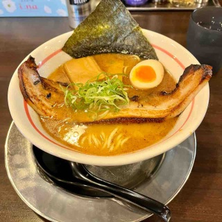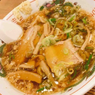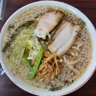YouTubeに上がっていた出身店の食レポ動画を見て気になり、その出身店を調べて訪問。駐車場の空き待ちの車が郊外らしく広い店内、コロナ禍中に広まった、アクリル板で仕切られたテーブル席の一つに案内された。あごだしラーメン中(950円)の食券を購入。浮かぶ背脂と太麺から燕背脂ラーメンを思わせる見た目のラーメンが出てきた。あごだし特有の淡くも力強い旨味が動物系出汁、タレの醤油、そして背脂と相まって最後まで味を牽引していたスープ。強く縮れた麺を啜ると、序盤こそもちもち感があったが、すぐにボソッとした食感となり小麦粉の塊となった。やがて旨味の花が力強く咲き、スープとの共演を楽しむことが出来た。具は、柔らかく、肉自体味とタレのバランスが絶妙だったチャーシュー、サヤエンドウ、細切りメンマ、白ネギ、海苔。各々の主張が強い燕背脂ラーメンに主張はするが、一体感も見せていたラーメン。やっぱり食べなければ分からないと思いながら退店。宮城県仙台市若林区六丁の目東町2-10営業時間6:30~10:00(9:45 L.O)11:00~15:00(14:45 L.O)18:00~22:00(21:45 L.O)定休日火、第2・4月