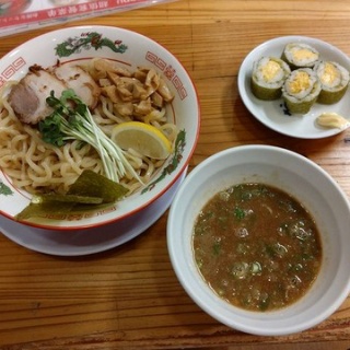 新橋の銀座口にある、和歌山ラーメンのお店です。和歌山ラーメン店のつけ麺ってどんな感じだろう~・・・と思いまして、突撃!!つけ麺+玉子巻寿司、カモンヌ!!玉子巻寿司は、写真を見て反射的に買ってしまったw和歌山ラーメン的には鯖寿司じゃないのかーーーい(/・ω・)/麺は加水率やや高めの中太麺!トッピングにレモンがあるのが面白いですね!!スープはややドロっとした、魚介+豚骨なのですが・・・まったく特徴がない、めっちゃスタンダードなつけ汁じゃないですかー!!レモンで味変はできますが、新鮮味はナイ!和歌山ラーメン風を期待して行かない方がよかった!!(まずいわけではないです!)しかし、銀座で800円台でこれがいただけるのは有難いかもね!玉子寿司は・・・まんまですな!!最後はスープにつけながら食べたヨ!!和歌山中華そばとシュウマイがウリの店でございますが・・・外国人店員さんとともに、さらに和歌山から遠ざかったメニューがラインナップされていて、吹き出してしもたwもはや何でもアリアリですな(^^;和歌山と言えば、ライオンズ西口監督。そろそろ現地までラーメンツアーに行きましょうかね~!!◆天鳳 新橋店東京都港区新橋1-8-6 近江ビル