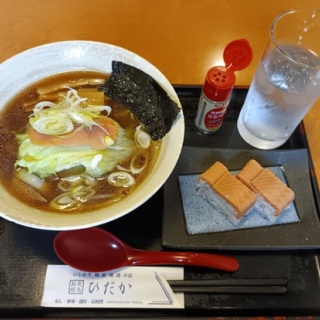 石狩市花川南の幹線道路沿いに店を構える「鮨爽醇鳥(すしそうじゅんちょう)ひだか」さん。ミシュランガイド北海道にも掲載された名店で、その外観は高級寿司店のような凛とした佇まい。オーダーしたのは、ご当地グルメの「石狩鮭醤油ラーメンとバッテラ2個」のセット。お寿司屋さんが本気で手がけるラーメンと、特産の鮭を活かした押し寿司の共演は、まさに石狩の恵みを一皿に凝縮したような贅沢さです。最大の特徴は、チャーシュー代わりのスモークサーモン。熱で香りがスープに溶け出し、新感覚の調和を生んでいます。名脇役のシャキシャキレタスが濃厚な鮭の旨味をリセットし、石狩産小麦の中太ちぢれ麺とも相性抜群。セットのバッテラこそ、職人の技が光る真骨頂。酢飯に忍ばせた長芋の短冊の「シャキッ」とした食感が心地よく、混ぜ込まれたシソの香りがラーメンの後の口の中を爽やかに整えてくれます。スモークサーモンの塩気と酢飯のバランスが絶妙で、醤油をつけずとも次々と箸が進む。石狩の鮭を二通りのアプローチで楽しめ、非常に満足度が高いごちそうさまでした