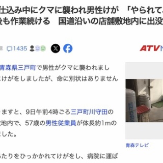 1 : 警察や町によりますと、9日午前4時ごろ三戸町川守田のラーメン店の敷地内で、57歳の男性従業員が体長約1mのクマに襲われました。 男性は眉間のあたりをひっかかれてけがをし、病院に運ばれましたが、命に別状はありませんでした。 店の関係者によりますと、男性は当時1人で開店前の仕込み作業をしていて、襲われた際に反撃し、クマは逃げたということです。 その後、出勤した店の関係者が、作業を続けていた男性のけがに気づき、事情を聴いたところ「やられて、投げ返した」と被害について話したことから、警察と消防に通報しました。 全文はソースで 2 : この店長つええ 3 : クマと友情が芽生えるパティーン