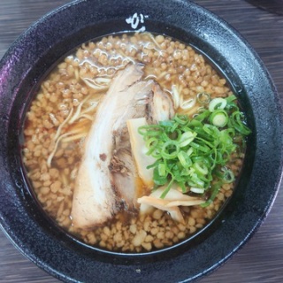 今回のお店は「麺や城」です。 内観や駐車場など 入口の横に灰皿が置いてあります。店内はカウンター席とテーブル席と座敷があって禁煙。カウンターに5席と大小のテーブルが計5卓。座敷に3卓。駐車場はお店の前にあります。 メニュー 今回は鶏ガラ煮干し中華(950円税込)を注文しました。麺は細麺と手打ち麺から選択。麺類注文でライス無料です。 鶏ガラ煮干し中華 おっ!これは予想外の見た目です。ネギ・メンマ・チャーシューの普通な醤油ラーメンを思い浮かべていましたが、スープに細かい背脂が大量に浮いています。スープの味が気になるところです! レビュー このスープうっま!鶏がらと煮干しに加えて背脂たっぷりなので豚の味もするトリプルスープのような味わいです。動物系と魚介系のどちらもお互いの味を際立たせており、スープが喉を過ぎても余韻に魚粉の風味が香ります。煮干しだけでは出ないコクと背脂の甘味も旨しっ! 麺は手打ちを選択。まるで柔肌のような手打ち麺独特の滑る舌触りとモチモチとしたほどよいコシ。スープとの絡みもいい感じです! チャーシューは2枚入りでホロホロよりトロトロの溶ける柔らかさ。箸で持ち上げると崩れるほどです。噛むと肉の旨味で口の内がいっぱいになります。 ライスに麺を乗せ、スープをかけたら箸でかき込む!米と麺の炭水化物コンビにスープの塩味と豚の背脂がよく合います!もう一杯おかわりして完食。 まとめ 鶏がらと煮干しだけではなく豚の背脂も入っていたのがよかったです。手打ち麺のモチモチした噛み応えもグッド!かなり美味しかったです。 ごちそうさまでした。 店舗情報