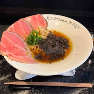 訪れたのは13時過ぎ、外観を見るとお店が閉まっている様に思いましたがOPENの札がかかっており扉を開けるとシックな雰囲気の店内。空いていたカウンター席に座りメニューを拝見、ラーメンは3種類あり今回は「琥珀」(2,000円)をいただくにしました。先ずは着麺する寸前に店主さんが目の前でラーメンにトリュフを削り入れてくれます。どんぶりには、レアチャーシュー、穂先メンマ、刻みネギ、柚子、たっぷりのトリュフが贅沢に盛り付けられ、スープは醤油色に澄んでいます。スープは名古屋コーチンなどの銘柄鶏を使った清湯、鶏油が厚みを与え、まろやかな醤油のコクや塩味がクリアーな鶏の旨みを引き立て、華やかなトリュフの香りと柚子の香りが広がります。麺は太陽製麺の特注麺が使われぷるっとした弾力のあるコシ感があり喉越しや歯切れが良くスープも馴染みます。穂先メンマは歯切れが良く、トリュフが徐々にスープに馴染む事で更に全体の風味を豊かにしてゆきます。チャーシューには、塩味の強さが無い生ハムの様な旨みを感じる豚肩ロースのレアチャーシューと風味が豊かで濃厚なコクを感じられる近江牛のカッパローストの2種類が使われておりどちらも美味しくいただきました。 ガラス容器で提供されるキムチは程よい辛さと濃厚なコクと甘みがあります。ラーメンとしては価格が少し高めですが、トリュフの香りも楽しめ贅沢な気分になれコスパの悪さは感じられませんでした。【店名】Ra-Maison HAKU【場所】大阪府大阪市天王寺区寺田町2-4-3 コーポいわき 1FJR 寺田町駅から徒歩5分駐車場無【営業時間】11:30〜15:0017:30〜22:00定休日 月曜日表示価格、メニュー、営業時間、定休日等は訪れた当時の情報の為、店舗公式情報をご確認ください。