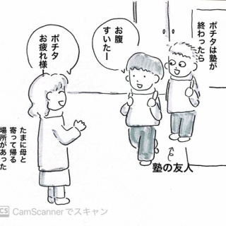 ポチタが小5、6年の寒い冬の頃、母がポチタと塾の帰りにたまに駅前の屋台のラーメンを食べて帰っては私に「ラーメンおいしかったわ。」というのでそれはそれは羨ましかった。だが単に母もポチタもおなかが空いて家まで軽く食べていく。ということの他に子供なのに勉強で忙しく遊ぶ暇もない息子にこれくらいしか楽しみを作ってやれないしとにかく元気に沢山たべてほしいし。みたいな感じだったと思う。母としては受験がどうこうよりもいつもポチタの食事や健康の事が最優先の人だった。いつも母はポチタの同じ塾の友達の子にも一緒にラーメンやらなにやら御馳走していた。というのも送り迎えの関係などで他の母親にもポチタが何かご馳走になることもあるし、お互い様というかんじであった。冬の寒くて暗いこたえる夜に塾で頑張った後ただ帰るのではなくあったかいラーメンを食べて楽しい夜の帰り道。に変えてしまう母であった。