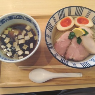 けらちょです。日曜日の13:15くらいに到着しました。待ちは無く、すぐに入店ですね。私は、特製昆布水つけ醤油(1,400円)を選択し、連れは醤油(950円)を注文です。醤油は手揉み麺に変更(50円)していました。カウンター8席、4人用テーブル1つの内、カウンター席に着席し、食べ方を読みながら待ちます。まず、醤油が着丼です。スッキリした感じの醤油スープですね。少し頂きましたが、やはり手揉み麺は良いですね。この食感がたまりません。手揉み麺を喜んでいると、私のつけ麺も着丼です。具は、2種のチャーシュー、味玉、みつ葉が、たっぷりの昆布水に浸かった麺の上に乗っています。中くらいの平打ちストレート麺が良いですね。そして、スープの中にはネギともう1種のチャーシューが入っていました。スッキリしたつけ汁が良い感じですね。ただ、いつも思うのですが、昆布水の味は好きなのですが、かなりヌルヌルしていて、お箸で掴みづらいですよね。。ちなみに、昆布水と塩で頂く麺も好きです。美味しかったですね。ごちそうさまでした。東京都江戸川区西小岩1-28-18 薗田ビル 1F小岩駅から2~3分くらいでしょうか。(北口?ヨーカドー側を出て線路沿いを右に進むとありますね。)だん善ラーメン営業時間 月曜日 11:00〜15:00 火~日曜日 11:00~15:00 17:00~22:00定休日 無休のようですね。