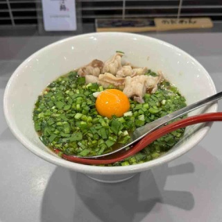 訪れたのはラストオーダー近くの14時半前、店内は空いており待つ事なく入店する事が出来ました。今回は食べようと決めていた1月末までの期間限定メニュー「旨辛ホルモンスタニラそば」(1,100円)用の限定Aの食券を購入し空いていたカウンター席で着麺を待ちます。どんぶりには、一面を覆う程のたっぷりの刻みニラが浮かんでおり、その横には白いホルモン、真ん中には卵黄が乗せられ見た目も鮮やかで食欲をそそります。スープは豚骨ベースの清湯、ピリッとした辛味とクラシックニンニクとたっぷりと使われたニラでジャンキーさ与え、醤油の塩味も程よくあっさりとしながらも深みのあるコクと旨みが感じられます。麺は今回の限定用に少し太くした棣鄂製のストレート麺、もっちりとしたコシ感と小麦の旨みがより感じられスープも良く馴染みます。ホンモンはぷるぷるとした食感で脂はコクがありながらもさらっといただけ麺を3分の2程食べたところで卵黄に麺を絡め最後まで美味しくいただきました。【店名】のだ麺 ~縁~【場所】大阪府大阪市福島区吉野1-19-10 JR海老江駅から徒歩4.分阪神野田駅から徒歩4分大阪メトロ野田阪神駅から徒歩3分駐車場無【営業時間】11:00〜14:3018:30〜22:00 (Lo21:45)定休日 日曜日 夜営業は不定休表示価格、メニュー、営業時間、定休日等は訪れた当時の情報の為、店舗公式情報をご確認ください。