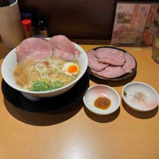 訪れたのは19時半頃、運良く空いていたお店の駐車場にクルマを停めお店に入ると満席状態、店内で少し待ちます。案内していただいたカウンター席に座りメニューを拝見、今回も火曜日と土曜日の夜限定の「窯出しちゃーしゅー麺」(1,530円)をいただく事にしました。どんぶりには、チャーシュー、メンマ、味玉、白髪ネギ、刻みネギ糸唐辛子が盛り付けられスープは白濁しており、別皿に厚切りされた窯出しちゃーしゅーが4枚盛り付けられています。スープは丸鶏、鶏がら、豚骨、野菜などを使った白湯、油分の強さがなくサラッとしており塩味の強さは無くまろやかなのコクと旨みが沁みるように広がります。麺はちぢれのある自家製麺が使われており小麦本来の旨みと仄かな甘みが感じられもっちりとしたコシ感もありスープも馴染みます。 窯出しちゃーしゅーは、どんぶりに2枚、別皿に4枚盛り付けられ厚みがあり柔らかく肉の旨みが詰まっており、2枚はラーメンと一緒に残りの4枚は専用の薬味を付けて美味しくいただきました。今回は息子を始めて連れて行きましたが、「和風窯出しちゃーしゅー麺」をとても気に行った様でお店を出る時には「または連れて来て欲しい」と言っていました。【店名】らーめん 鶴武者【場所】京都府京都市右京区西院矢掛町28-2 阪急 西院駅から徒歩6分駐車場有(2台分)【営業時間】11:30〜14:0018:00〜21:00定休日 金曜日表示価格、メニュー、営業時間、定休日等は訪れた当時の情報の為、店舗公式情報をご確認ください。